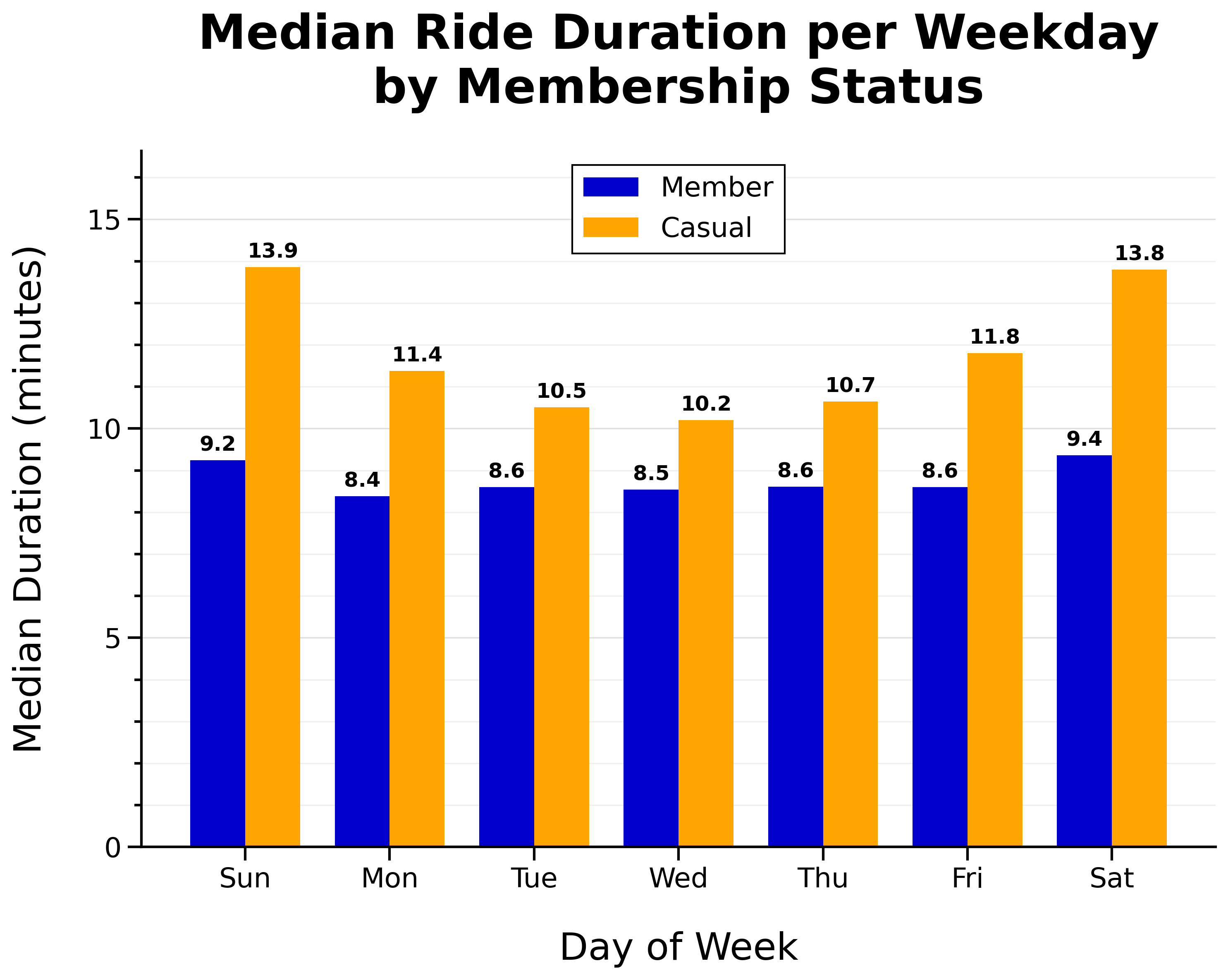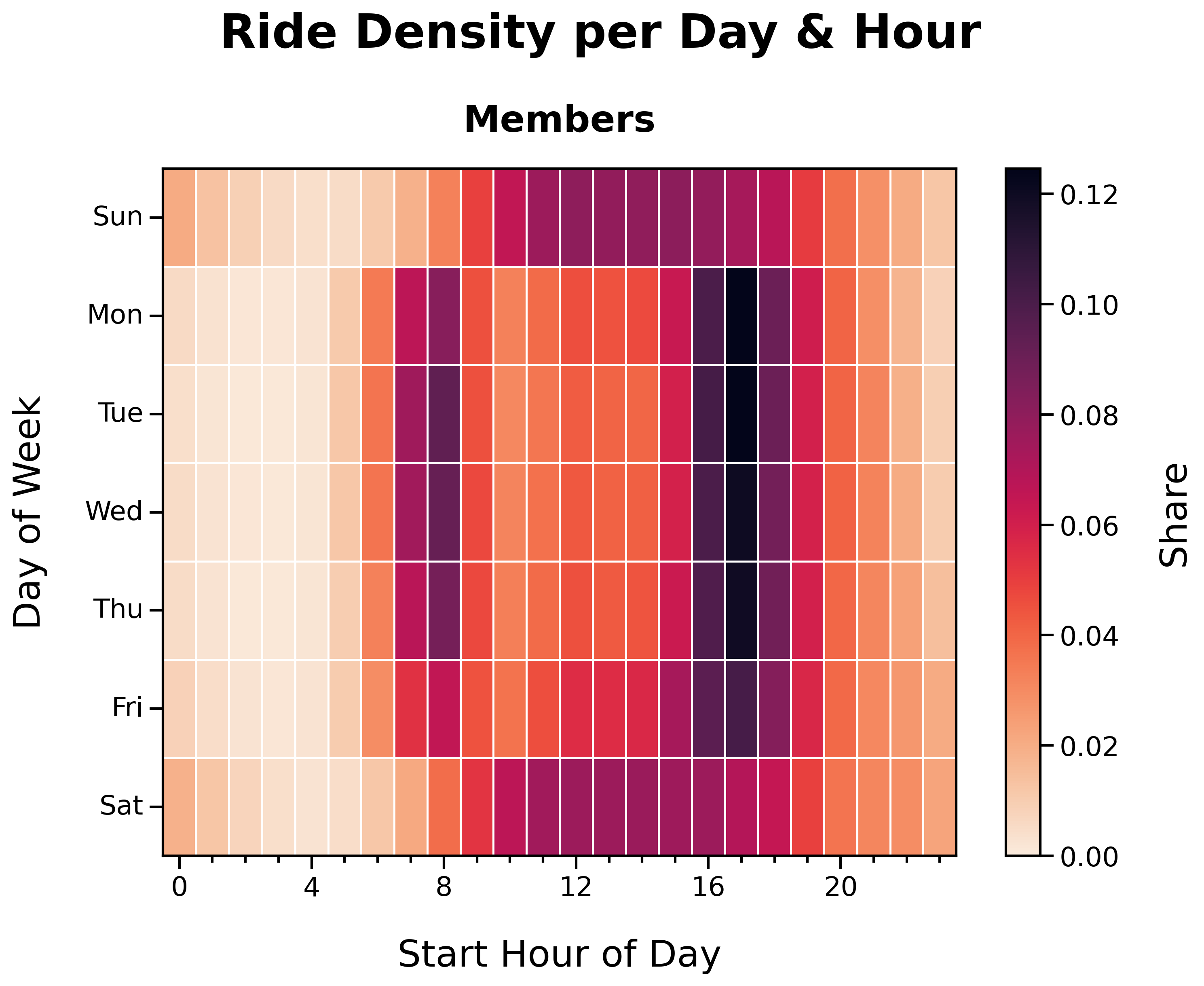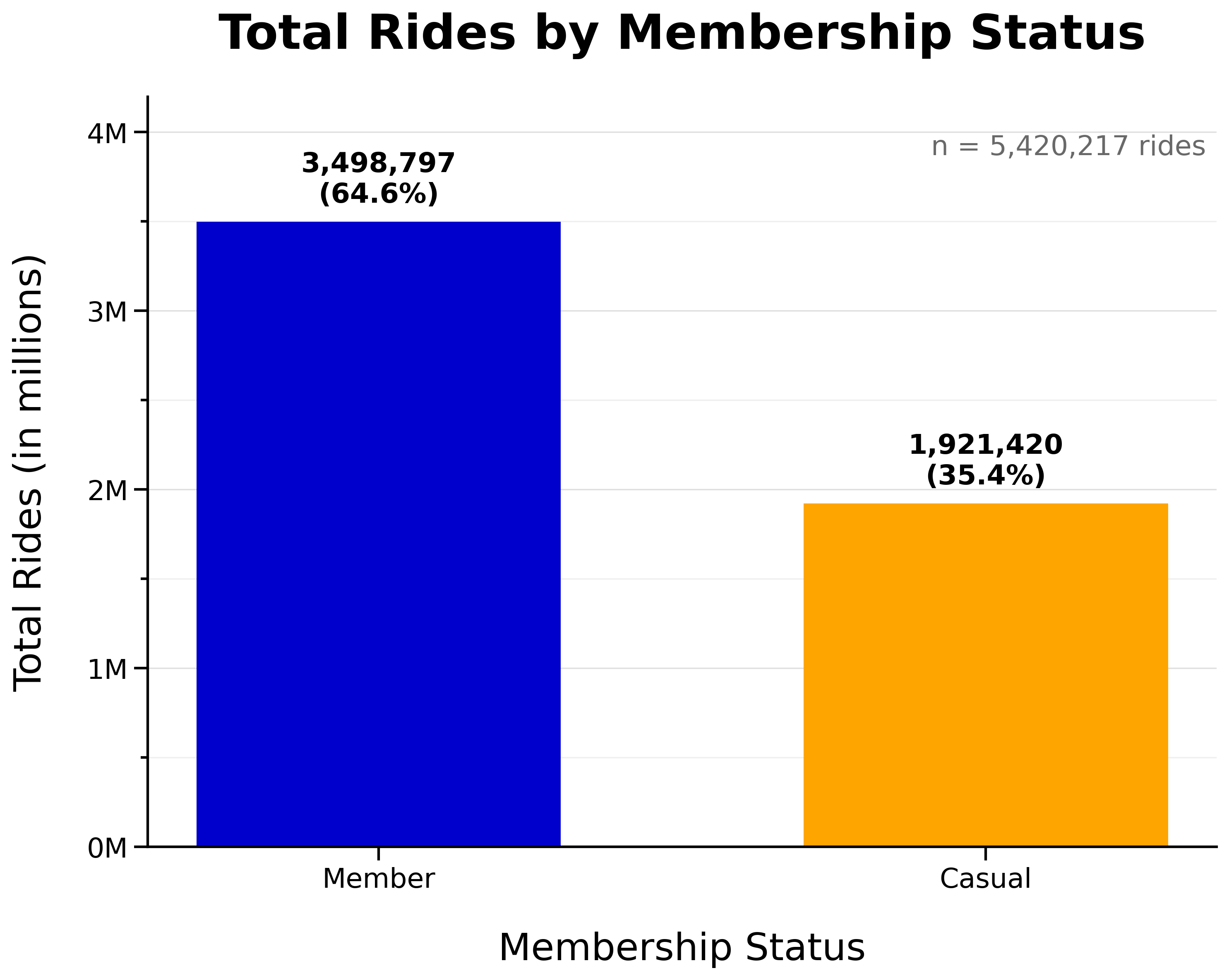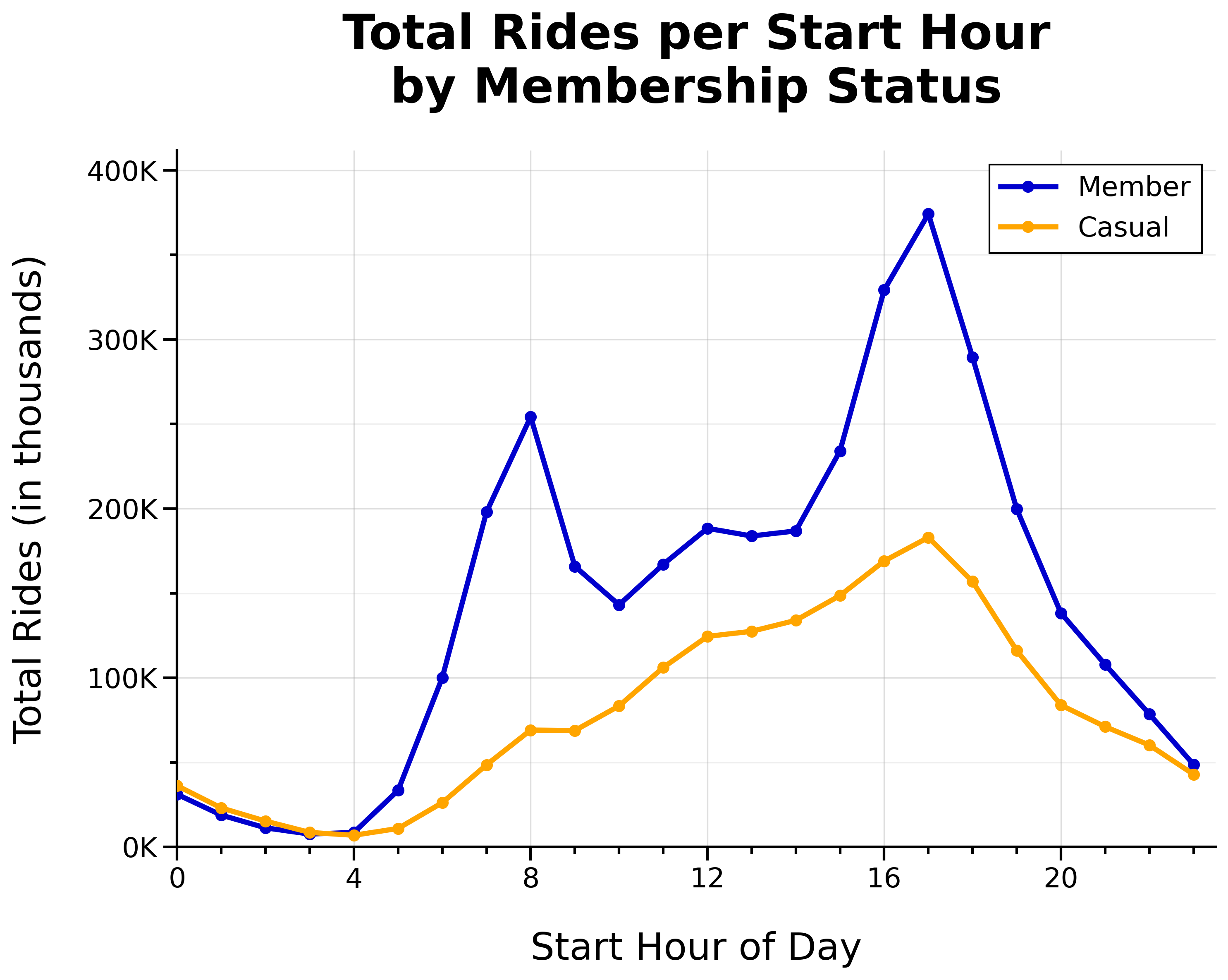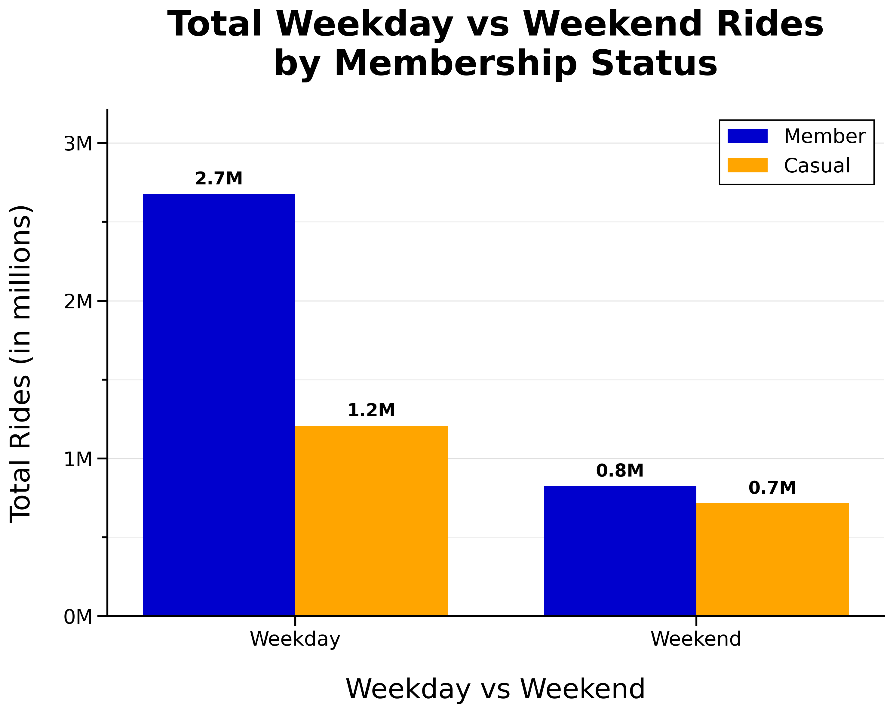 • Members account for most rides overall and show strong weekday commuter patterns, with clear peaks around 8 a.m. and 5 p.m.