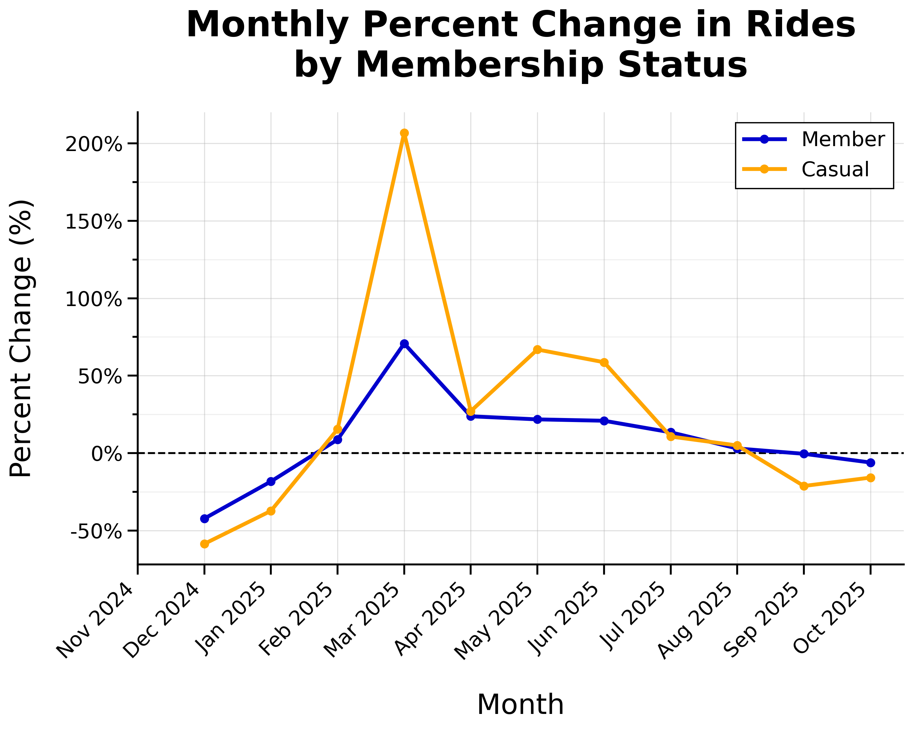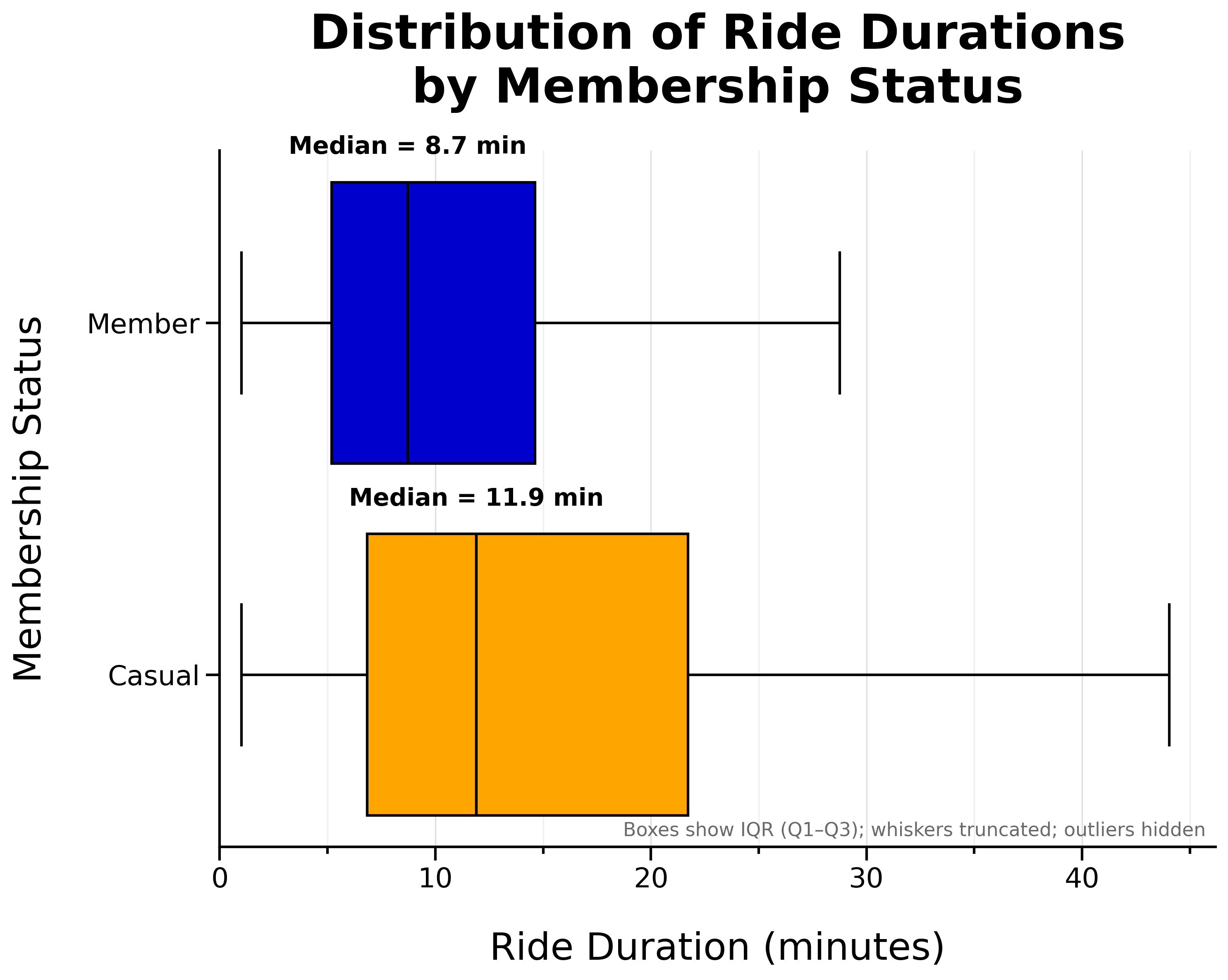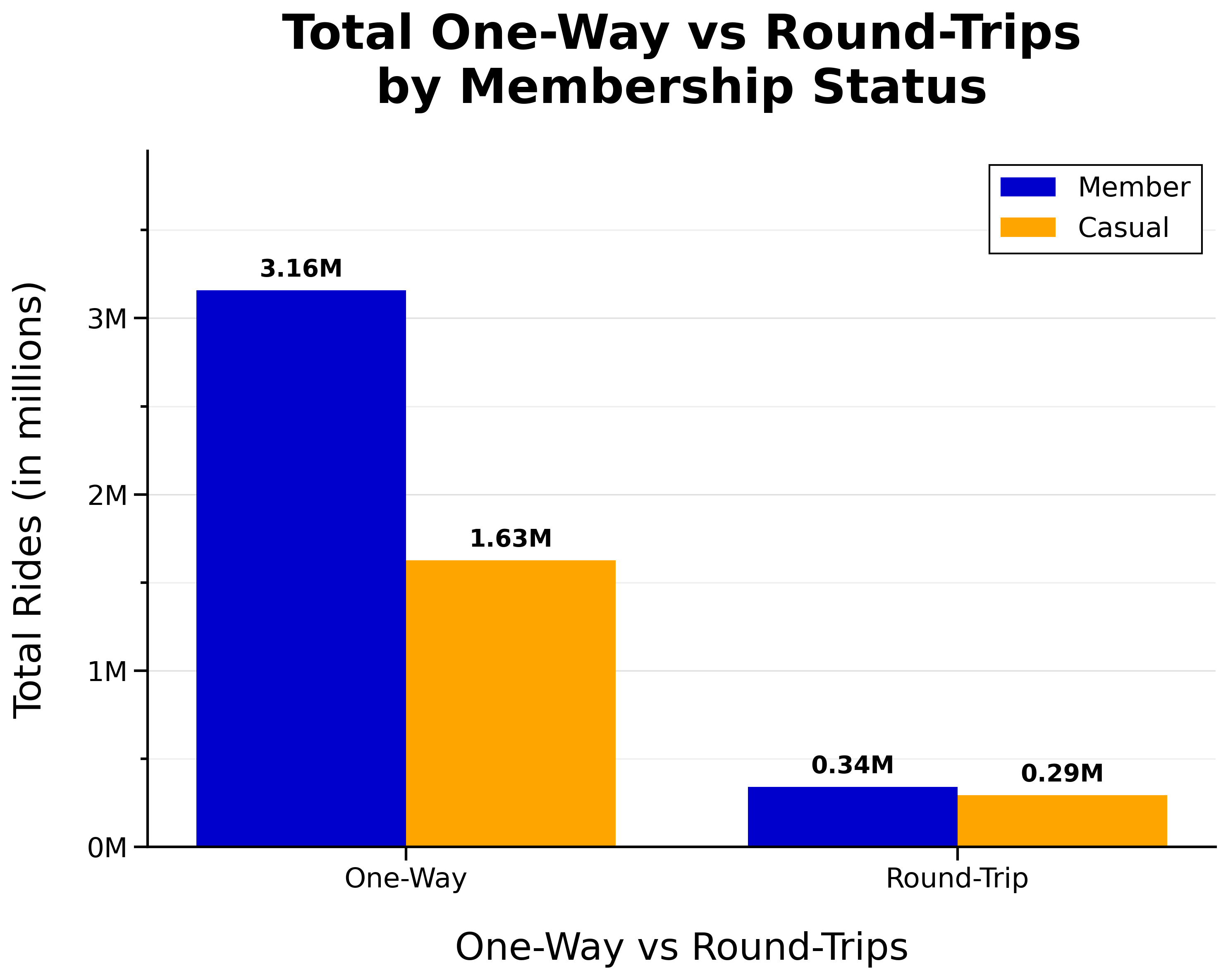• Casual riders are more active during warmer months, ride more on weekends, take slightly longer trips, and account for a larger share of round trips, suggesting more leisure-oriented usage.