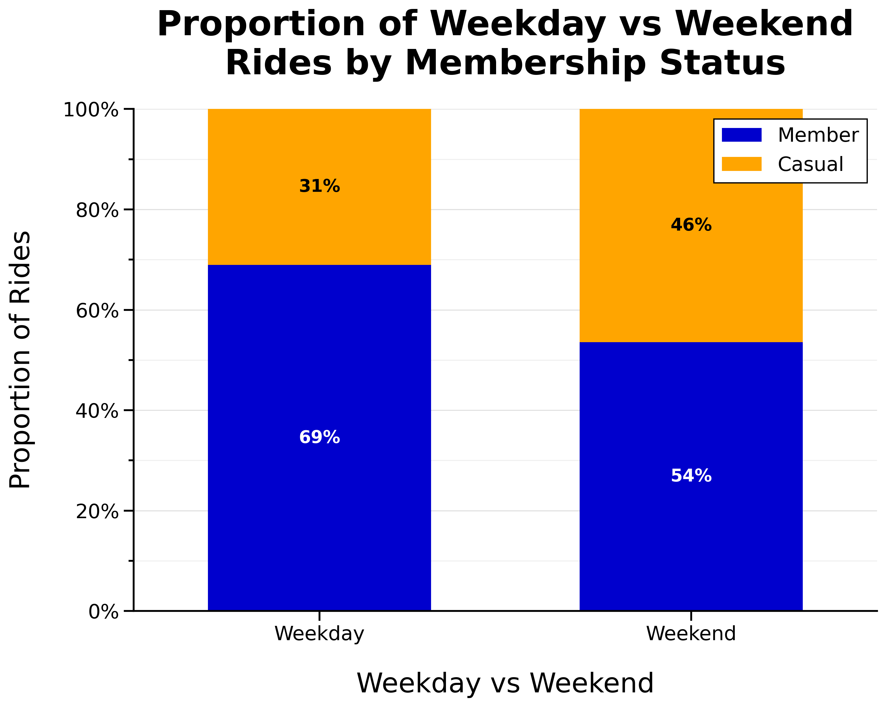 Proportion of Weekday vs Weekend Rides by Membership Status: