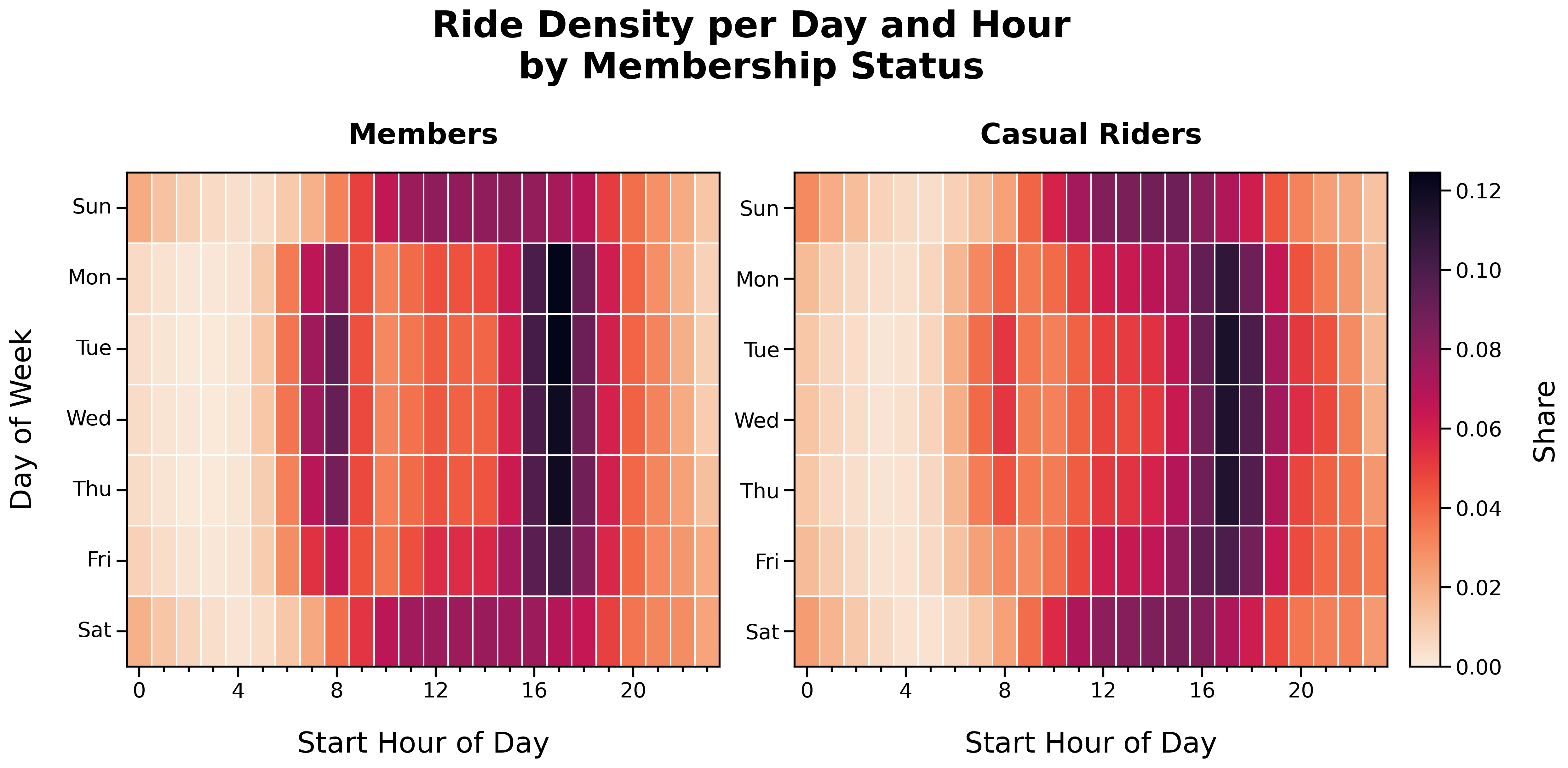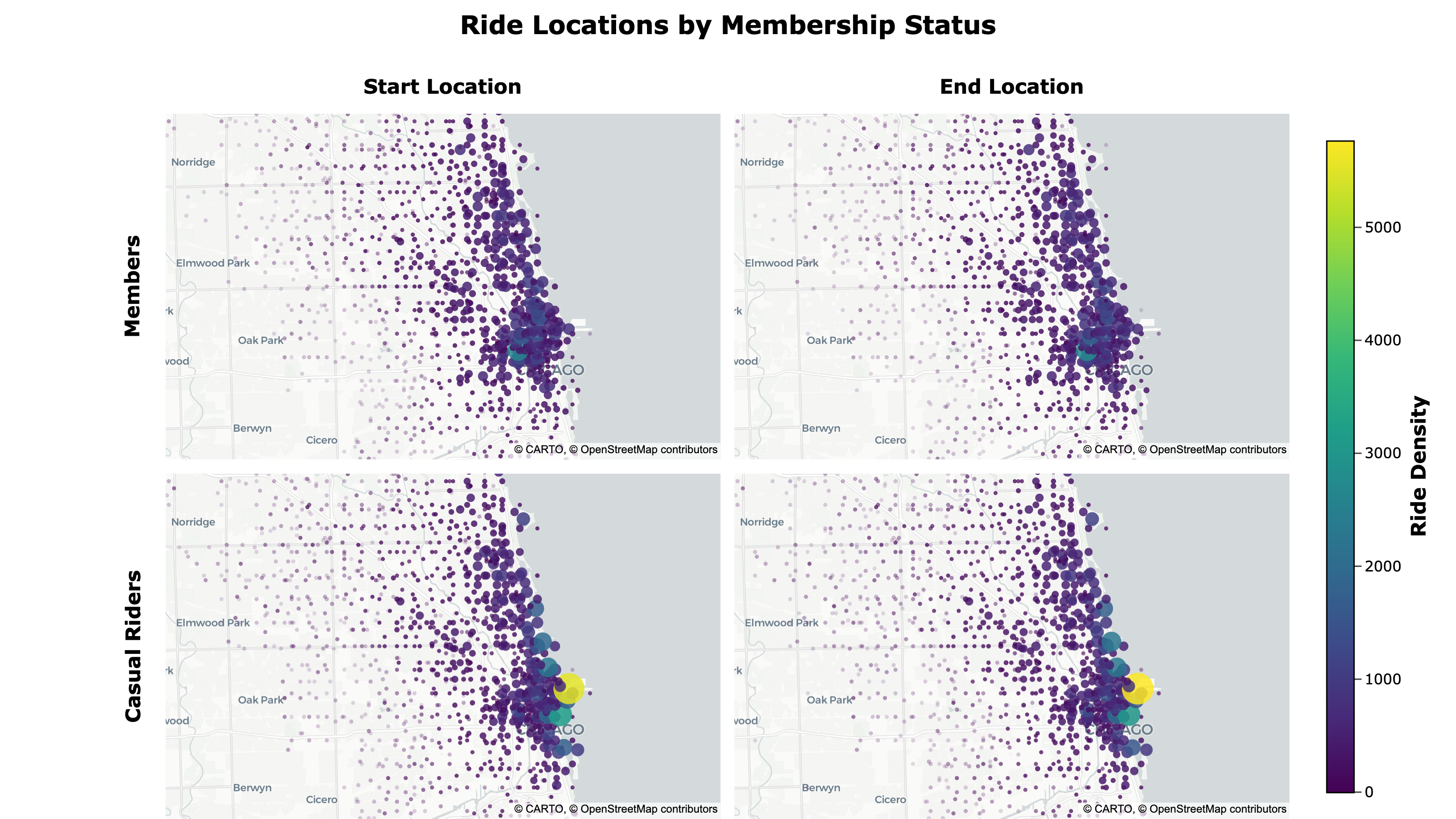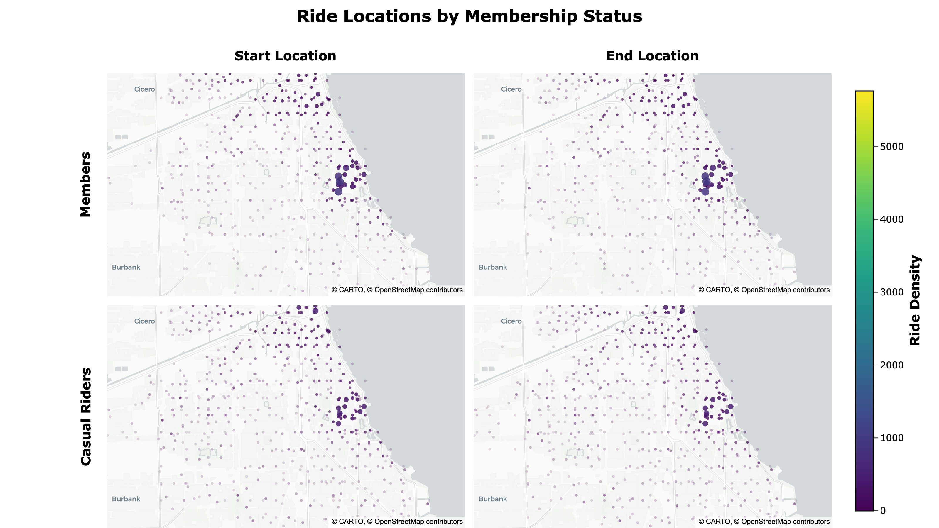 To better compare geographic differences, I created a dynamic, density-weighted point map showing ride start and end locations by membership type using Plotly. I exported it to HTML with custom JavaScript that links the pan and zoom of the maps and adds responsive scaling for different screen sizes.