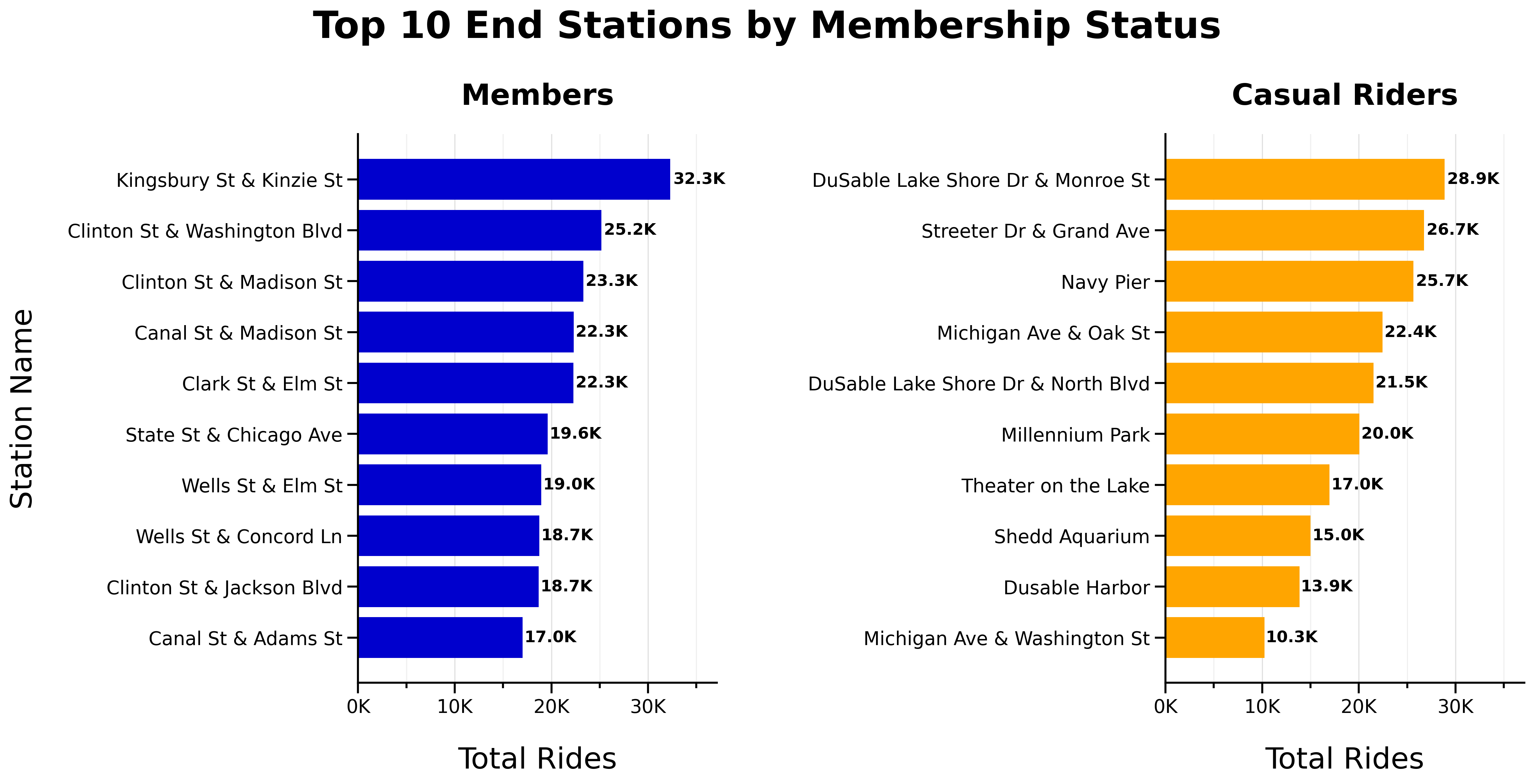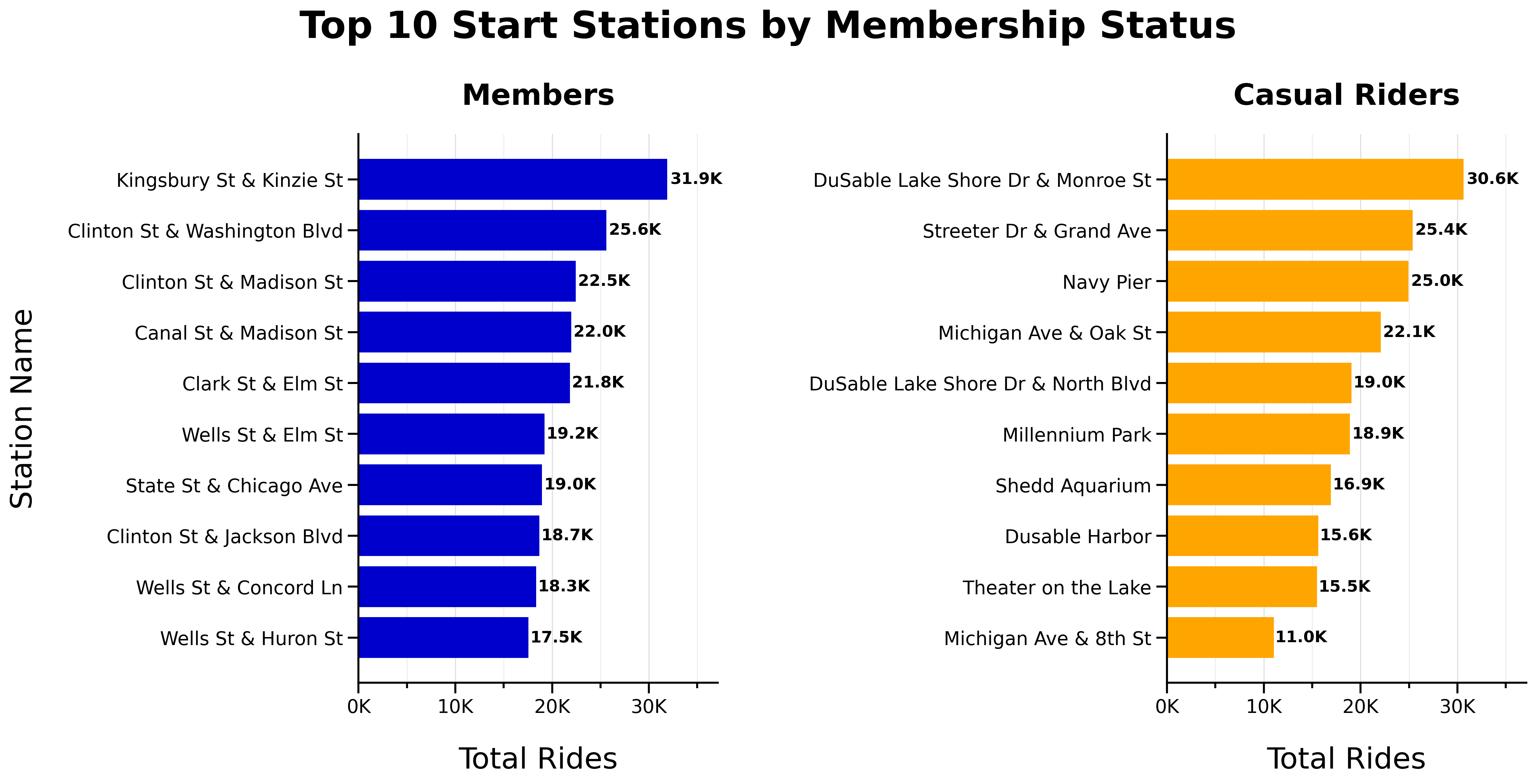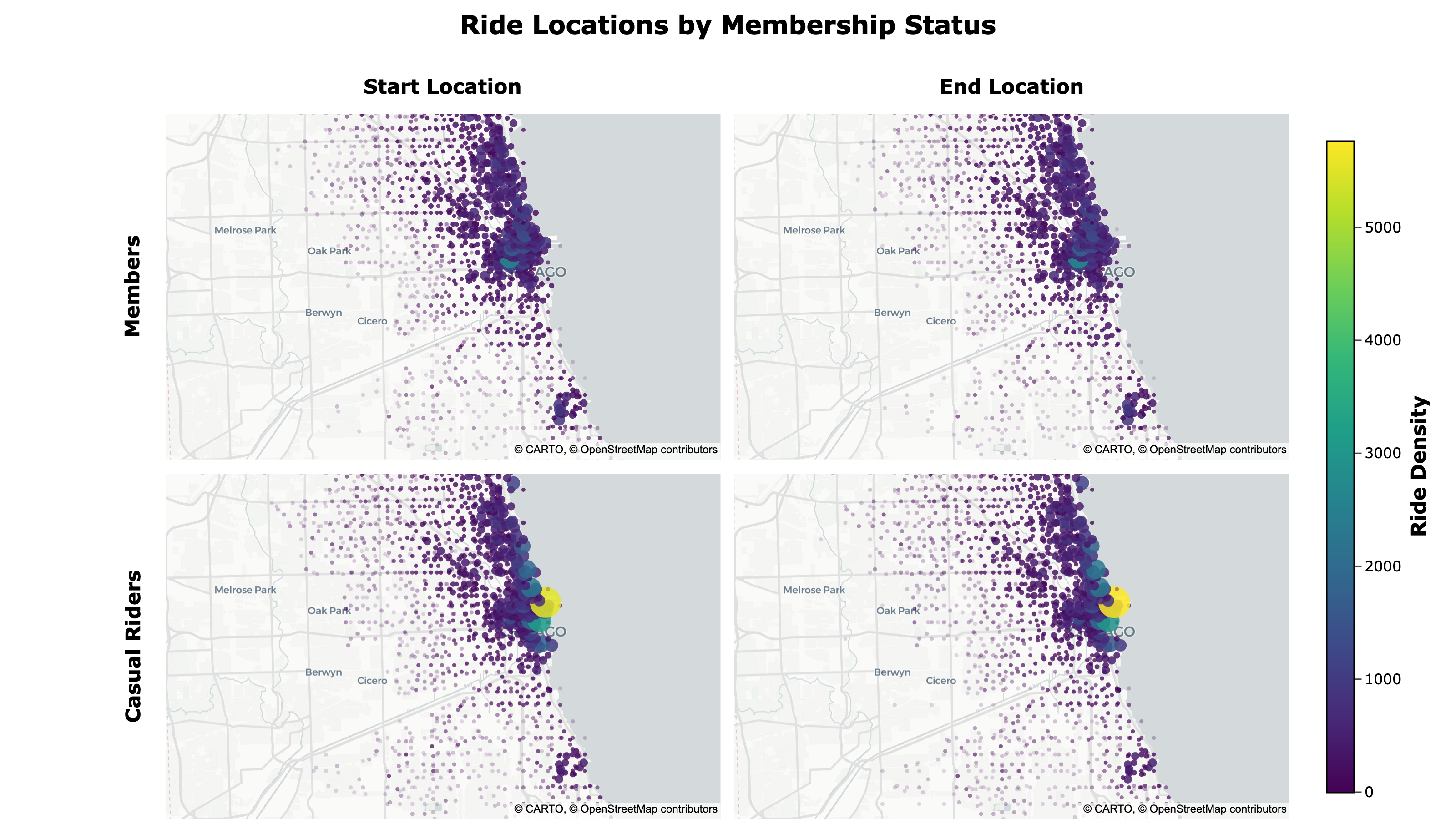 • Geography differs significantly: Casual riders tend to cluster near the lakeshore, while members are more dispersed throughout the city.