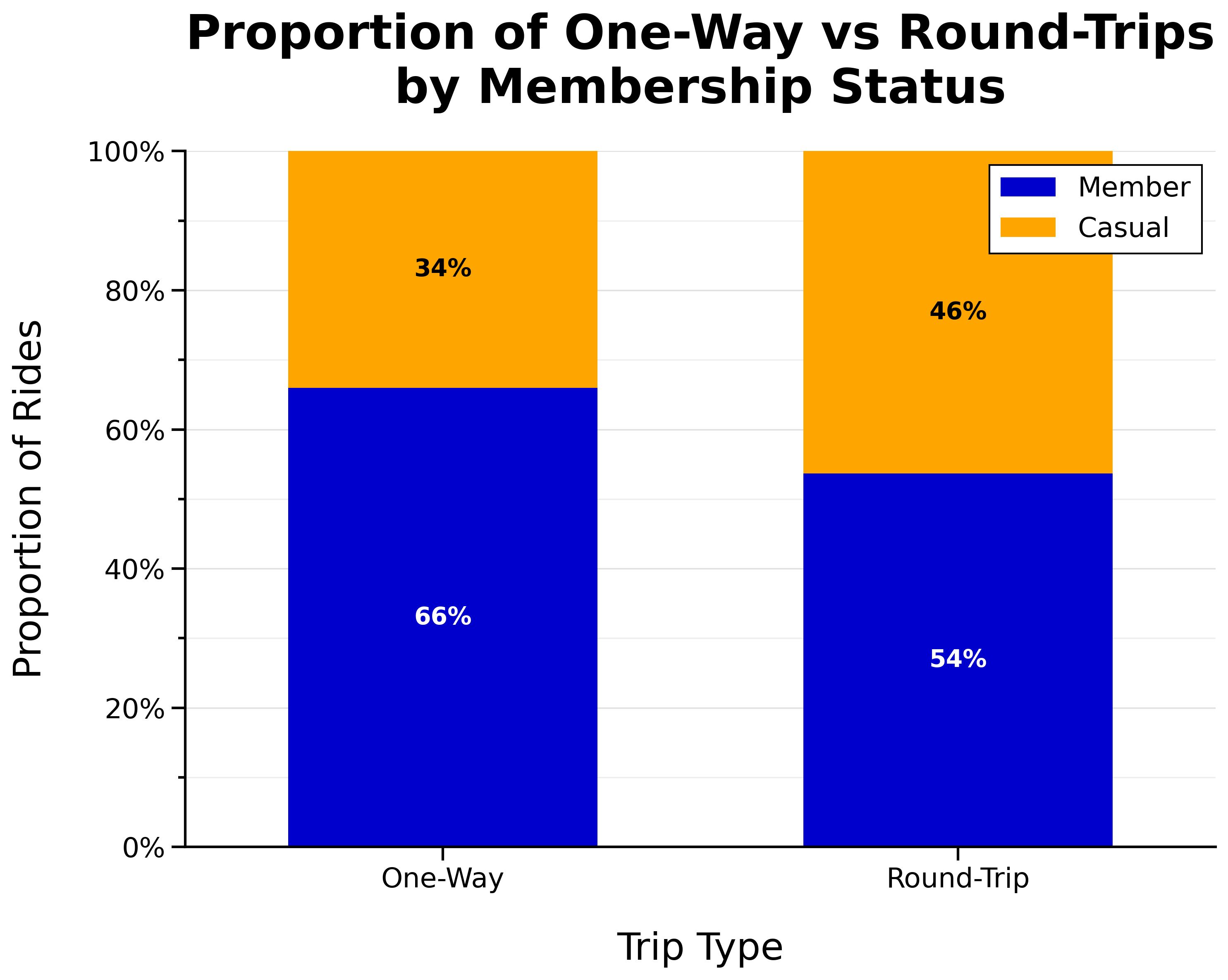 Proportion of One-Way vs Round-Trips by Membership Status:
