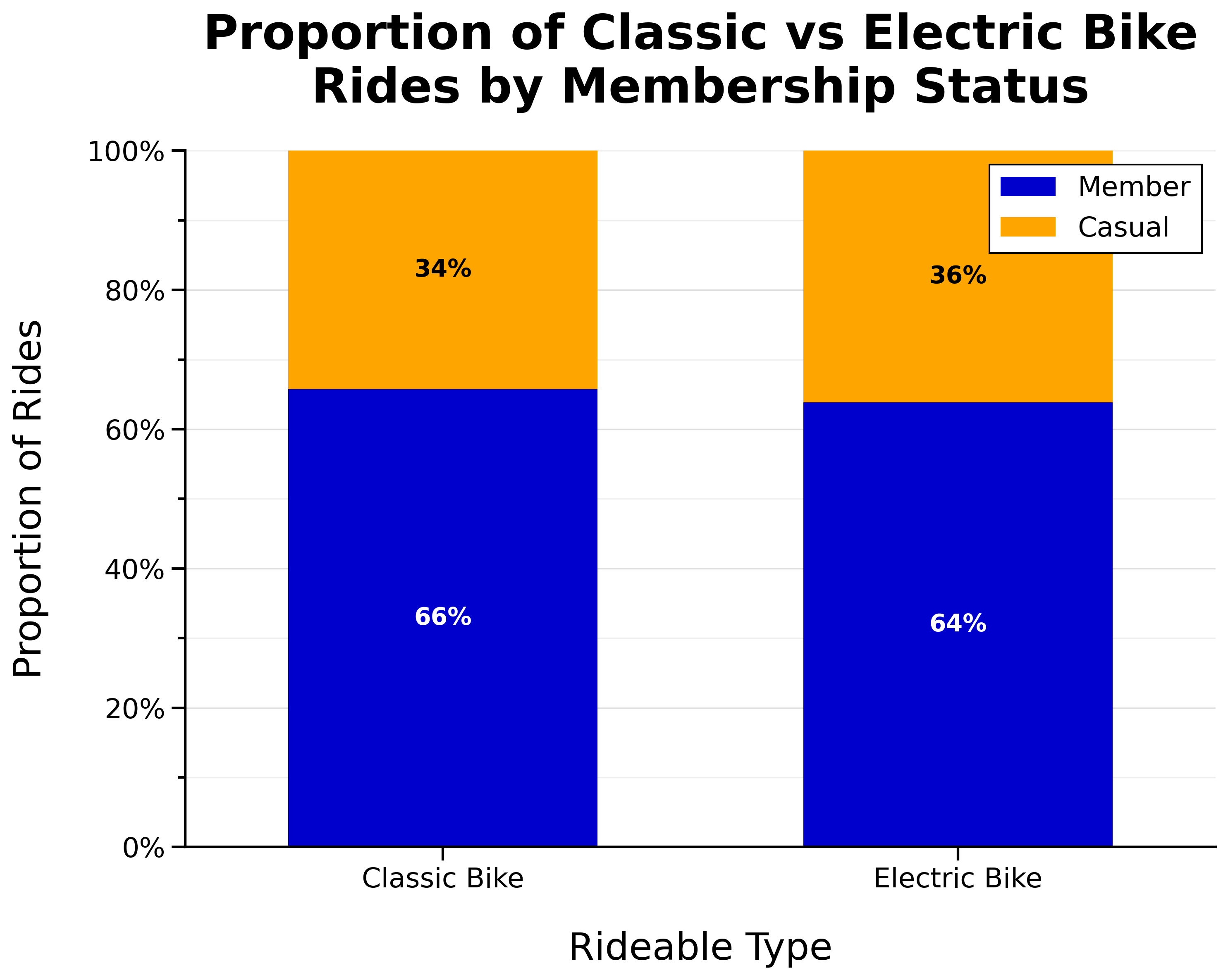 Proportion of Classic vs Electric Bike Rides by Membership Status: